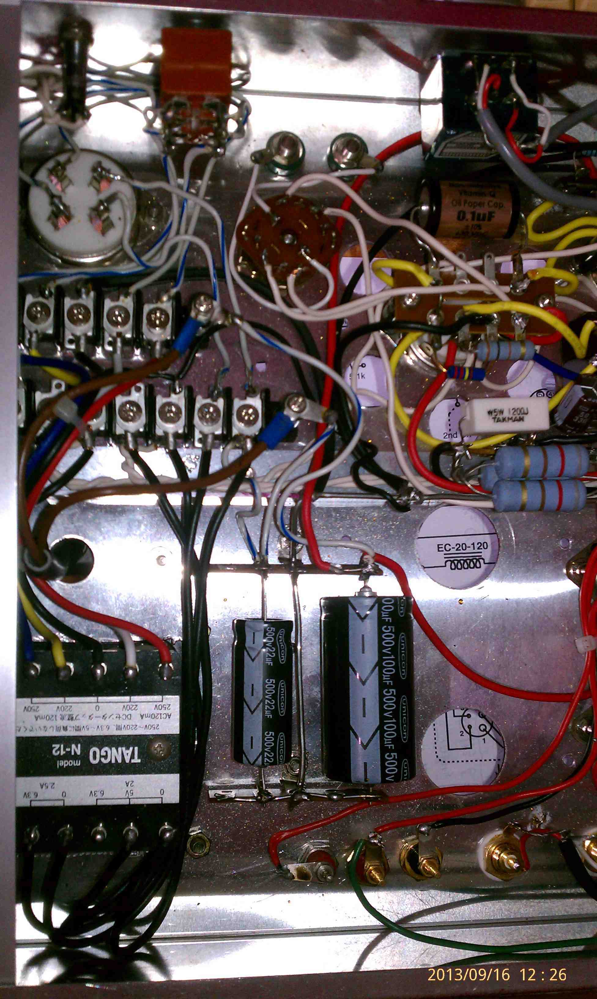 と言う訳で,アンプ本体はこれで完成。トランスは電源(TANGO N-12),チョーク(TANGO EC-20-120)のみが設置されています。真空管用ソケットは,左から整流管用(US-4pin), 出力管用(GT), 初段(12AT7,MT-9pin), 出力管用(GT)。