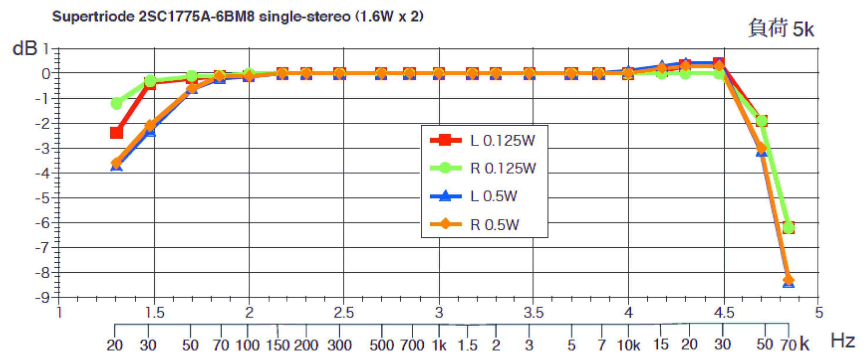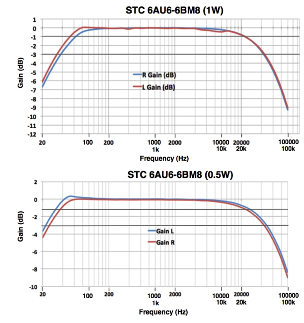 1 kHz入力でオシロ目視によるクリッピングは12.5W(R,L),-3dB: 20 Hz〜50 kHz (for 6V6G/マルコニー x 4)