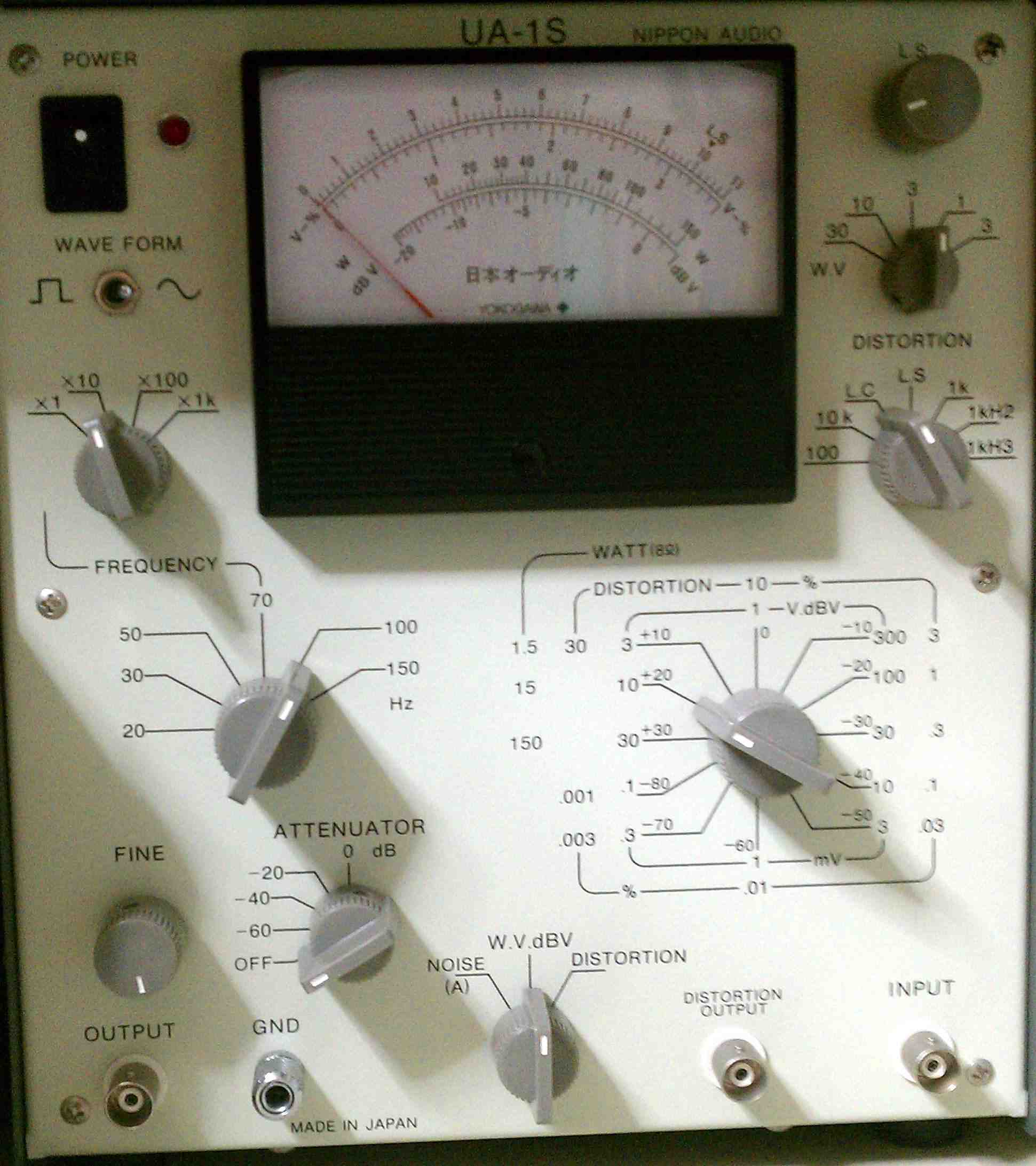 前面は,左から,電源SW,ネオン管,供給AC電圧選択SW(センターOFF),Vアッテネーター,入力切り替え(②系統,センターmute),NFB切り替え(センターオフ)。パネル上面の左右のバナナソケット(計4つ)と2つの切り替えSWは,初段および出力段のバイアス電圧とプレート電圧測定用です。UL/三結の切り替えSWと自己バイアス抵抗の切り替えSWもパネル上面(出力管ソケットの間)にあります。