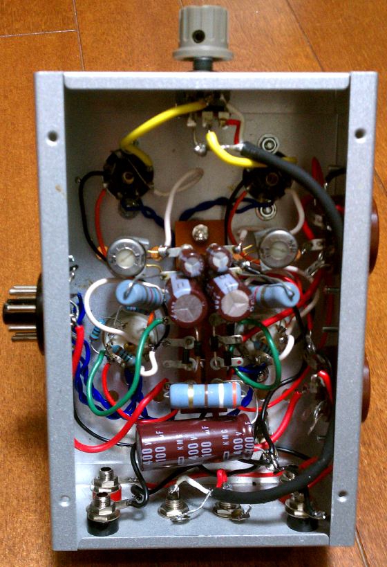 上のように,電源部(主にトランス)と出力トランスを使い回せ,amp部のみを制作できますので,今後,色々やってみたくなります。まずは,all真空管で6V6あたりで超三結を組んでみますか,,。この回路方式なら,結構変な玉でも終段に使える気がしますし,,面白いです。