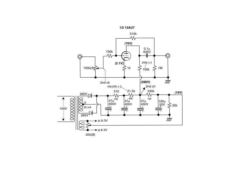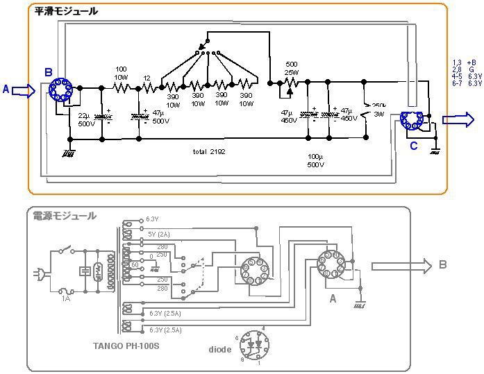 電源部:トランス TANGO PH-100 ダイオード/整流管を使い分け可。 250-0-250Vと280-0-280Vを切り替え
