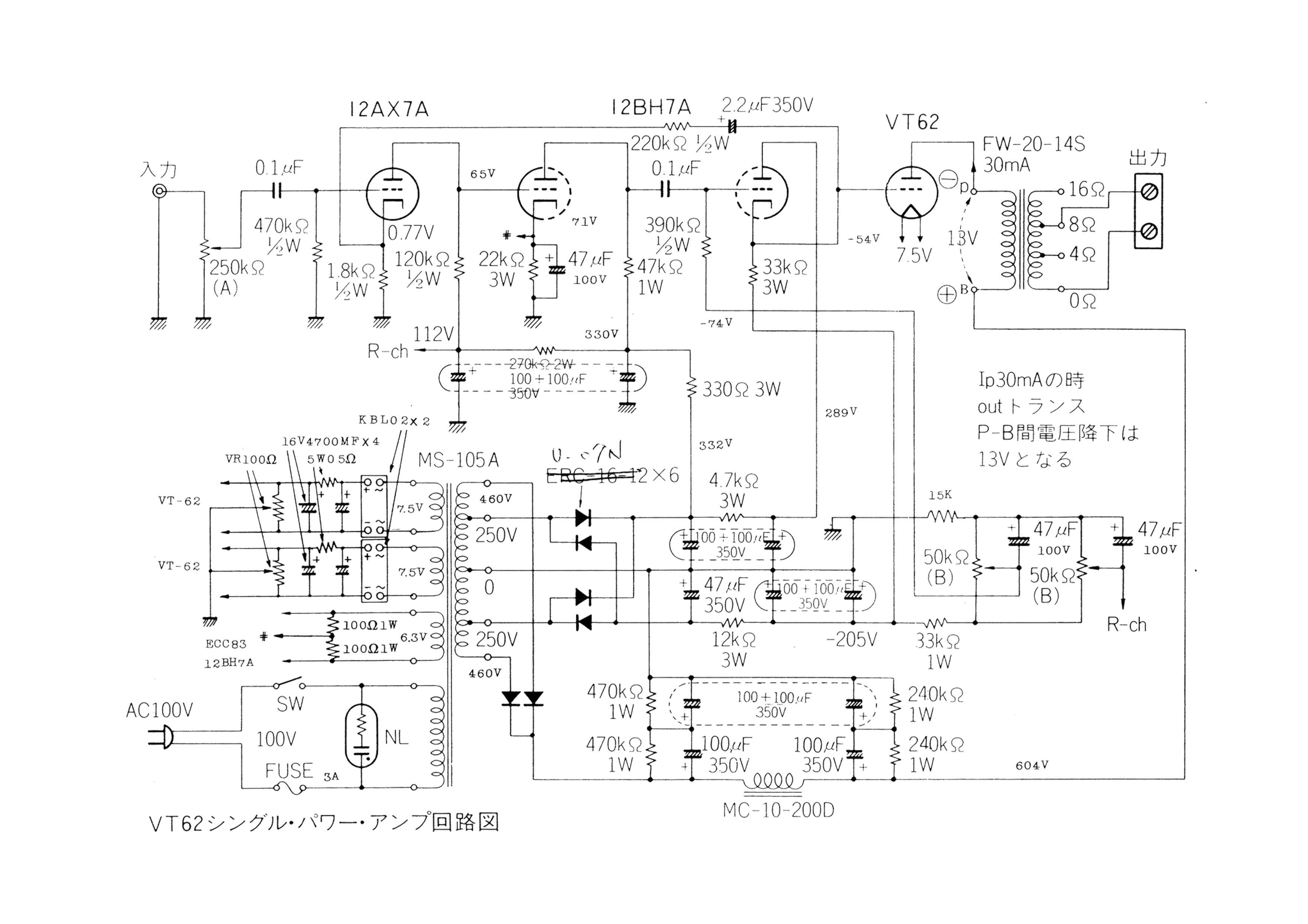 写真では整流素子を整流管としていますが,このampでは実際は使用しません。
