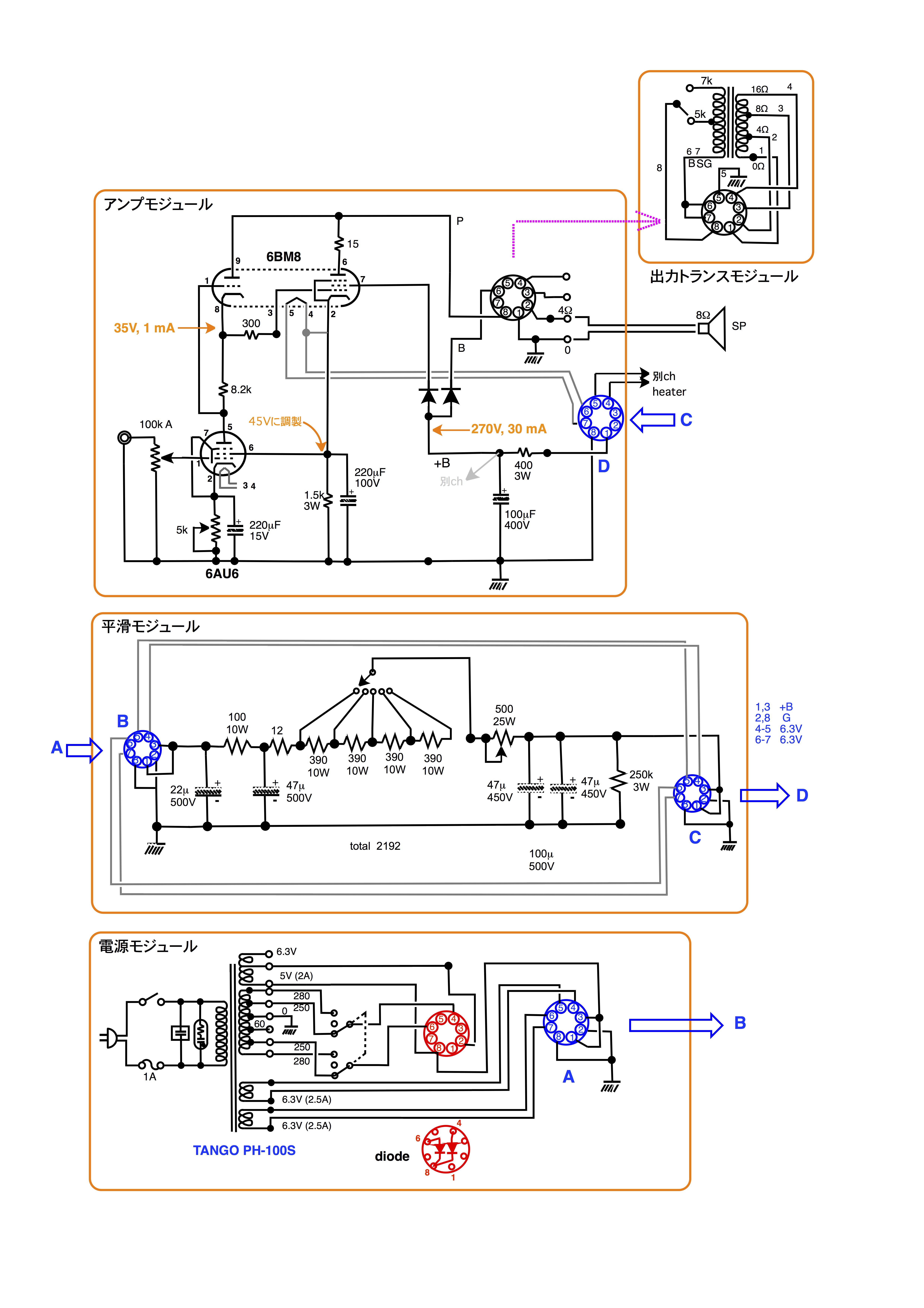 この電源部&平滑電圧調製モジュールをベースに,ALL真空管での超三結アンプを制作しました。