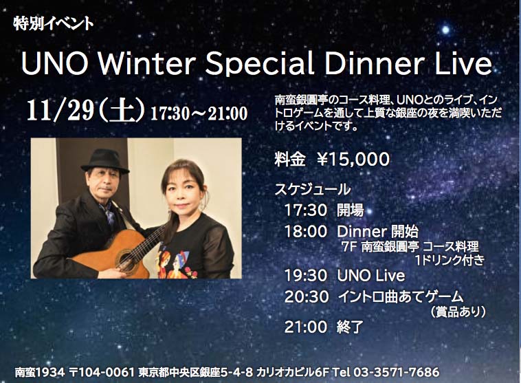 上階の老舗洋食店「銀圓亭」のコース料理、1ドリンク、unoのライブ(スペシャルゲスト有り)、昨年も盛り上がった「曲名当てクイズ(賞品付き)」など盛り沢山の内容で¥15、000となっています